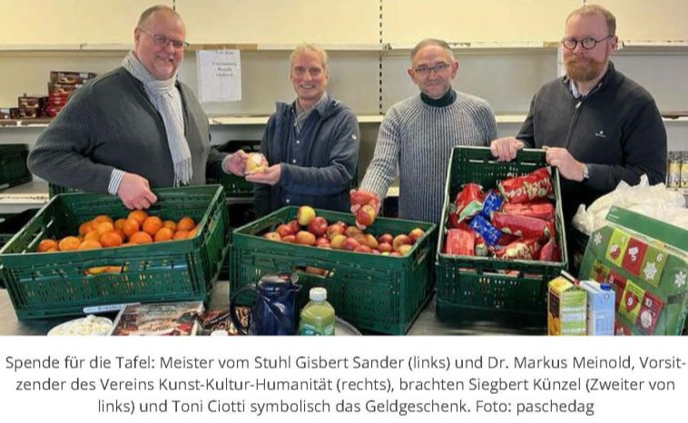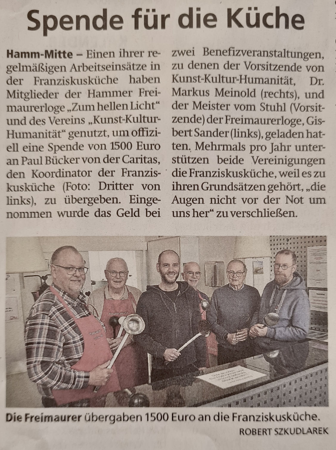 In die Riege der Spender für die Hammer Tafel hat sich jetzt auch die Hammer Freimaurerloge „Zum hellen Licht“ mit dem Verein Kunst-Kultur-Humanität eingereiht. Deren Meister vom Stuhl (Vorsitzender) Gisbert San-der und Vereinsvorsitzender Dr. Markus Meinold überreichten symbolisch 1500 Euro aus zwei Benefizveranstaltungen an Toni Ciotti und Siegbert Künzel. Beide freuen sich über den unverhofft großen Geldsegen zahlreicher Spen-der in diesem Jahr, der es der Tafel ermöglicht, Rücklagen für größere Aufga-ben zu bilden. Denn in den nächsten Jahren wird die Tafel im sogenannten „Trägerhaus“, das anstelle des abgerissenen Eisenbahnerwohnheims an der Ecke Kleine Alleestraße/Schwarzer Weg entstehen soll, ein neues Domizil fin-den und erhebliche Investitionen tätigen müssen. Willkommen sind die Spenden außerdem, um weiterhin den Fuhrpark mit drei Transportern zu unterhalten und einmal wöchentlich einen 7,5-Tonner zu leihen, um Spenden eines Großmarktes aus Dortmund abzuholen.