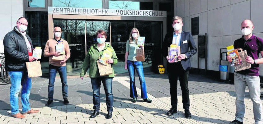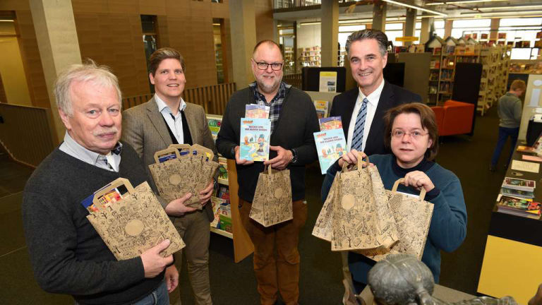 Die „ABC-Tüten“-Aktion des Freundeskreises Stadtbücherei starteten (von rechts) dessen Vorsitzende Luise Harms, Jürgen Edel (Meister vom Stuhl Freimaurerloge), Gisbert Sander (Vorsitzender Kunst-Kultur-Humanität), Büchereichef Jens Boyer und Altstuhlmeister Burkhard Lau. © Andreas Rother