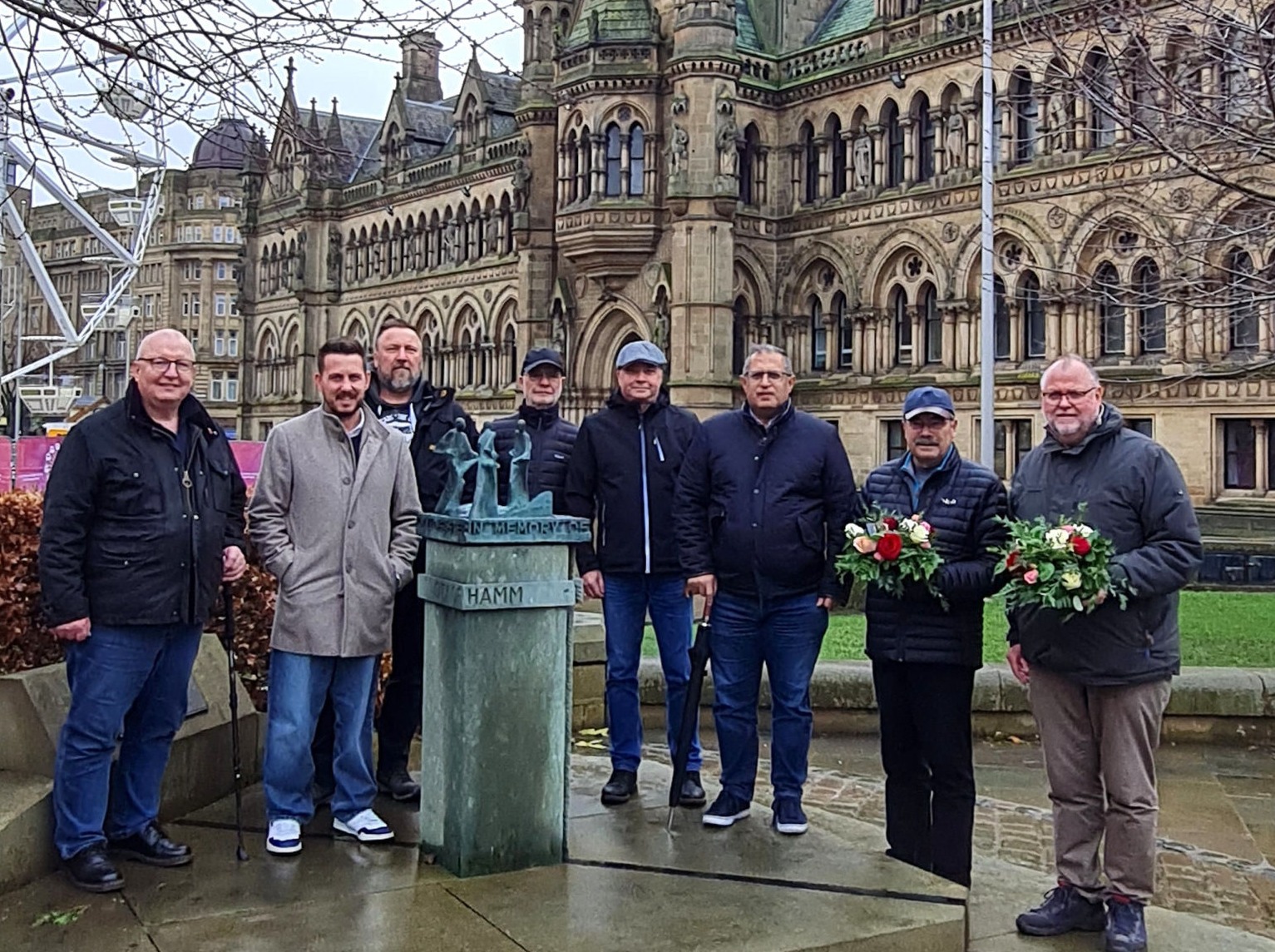 Gedenken in Bradford: Mitglieder der Hammer Freimaurerloge „Zum hellen Licht“ – darunter deren „Meister vom Stuhl“ Gisbert Sander (rechts) – und der Partnerloge „Hope“ in Bradford – unter anderem mit dem Vorstandsmitglied Steve Myers (Zweiter von rechts) – haben an dem von Jockel Reisner gestalteten Denkmal für die Opfer der Brandkatastrophe im Bradforder Fußballstadion Blumengebinde niedergelegt.